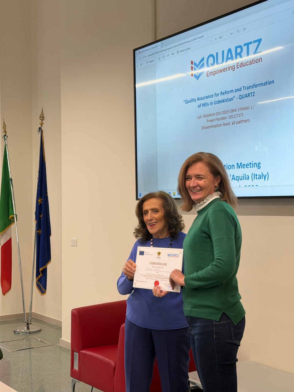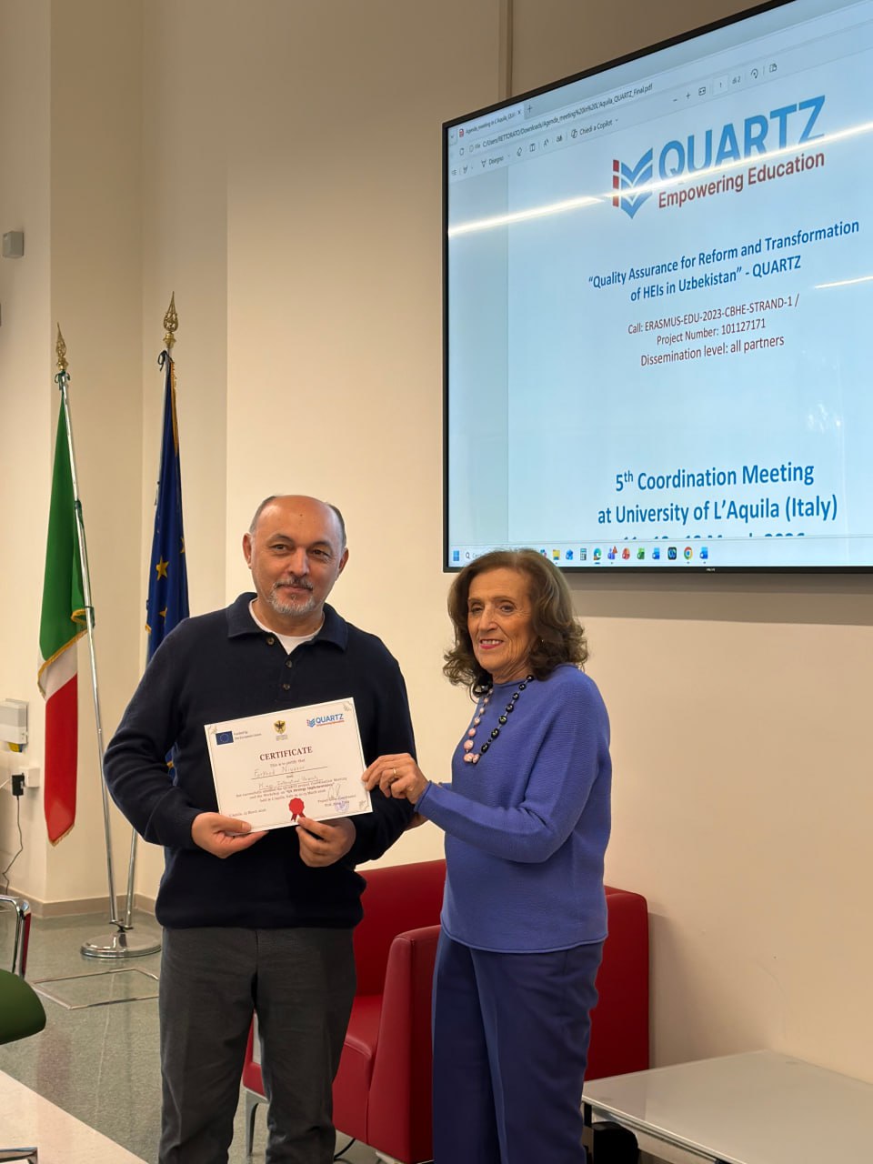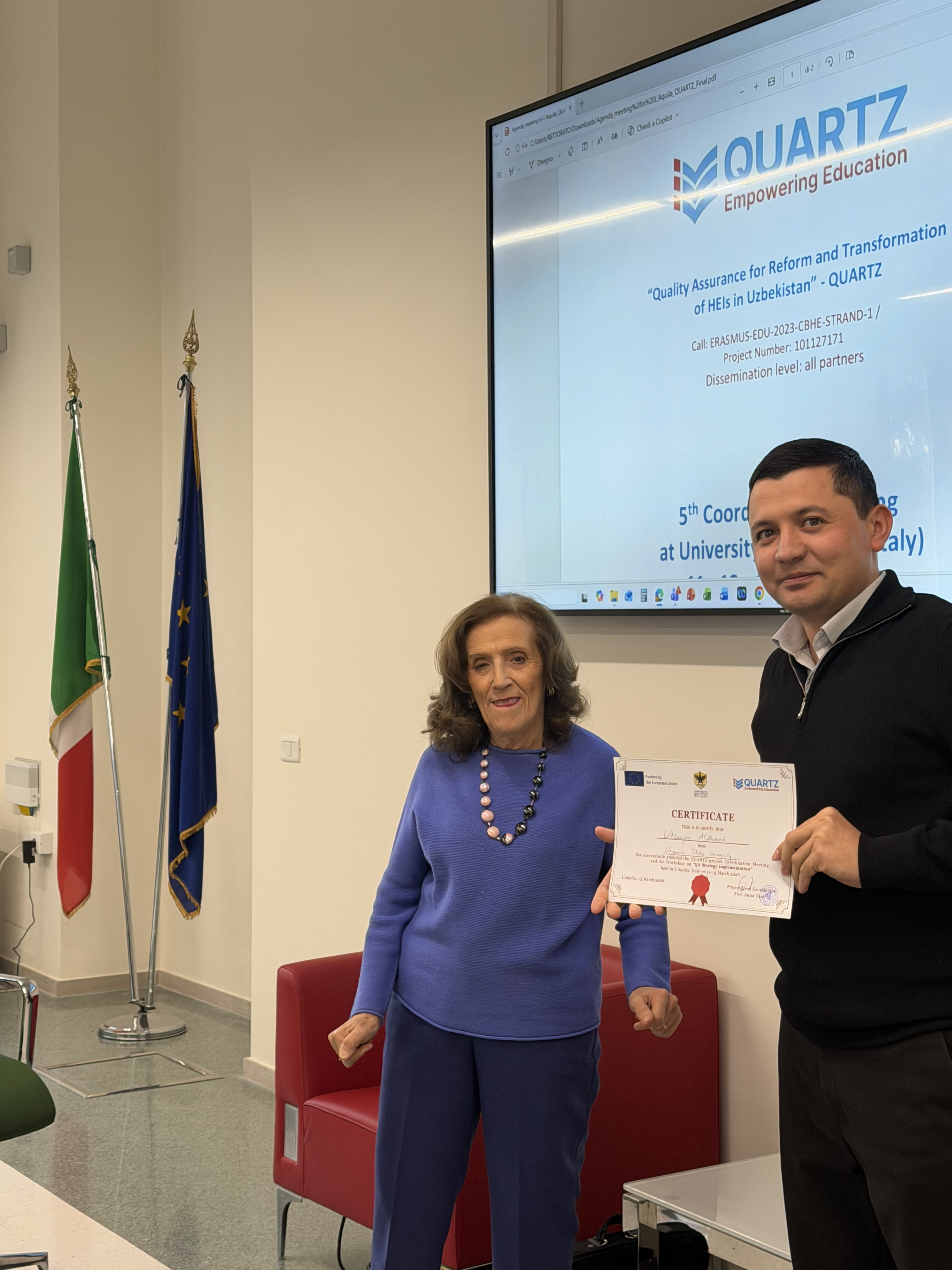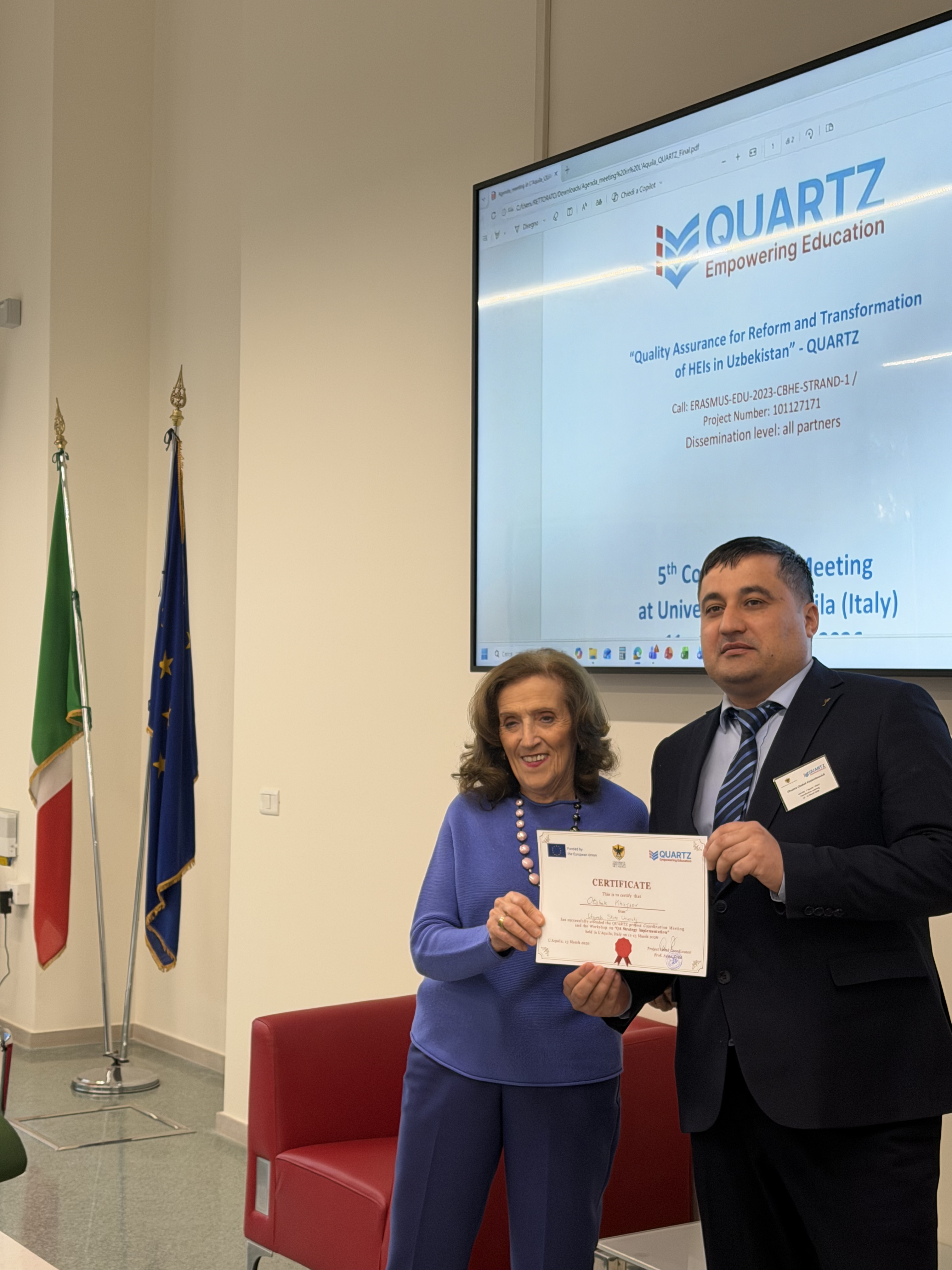 2026-yil 11–13-mart kunlari Erasmus+ QUARTZ loyihasining 5-koordnatsiya yig‘ilishi L'Aquila shahridagi L'Aquila universitetida o‘tkazildi. Yig‘ilish davomida loyiha doirasidagi yutuqlar, muammolar va kelgusidagi vazifalar muhokama qilindi.