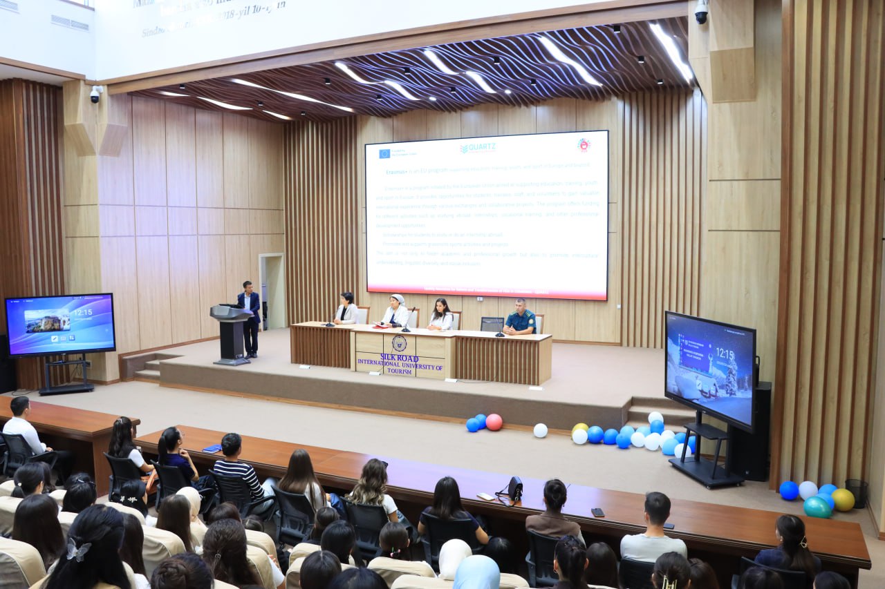 Universitetda bo‘lib o‘tgan “Tanishtiruv haftaligi” (Orientation Week) doirasida loyihaning universitet jamoasi iqtidorli talabalarga ERASMUS+ dasturining QUARTZ – “Quality Assurance for Reform and Transformation of HEIs in Uzbekistan” (O‘zbekistonda Oliy ta’lim muassasalarini isloh qilish va o‘zgartirishhamdasifatini ta’minlash) loyihasining mazmuni va mohiyati bo‘yicha taqdimotlarini namoyish qilishdi.Taqdimotlarda loyihaning vazifalari, loyiha hamkorlari, loyihaning veb-sayti va ijtimoiy tarmoqlaridagi havolalari haqida ma’lumotlar berildi hamda talabalardan loyihaning ijtimoiy tarmoqlariga a’zo bo‘lish, shuningdek loyihaning amal qilish muddati davomida amalga oshiriladigan tadqiqotlarda faol ishtirok etishlari so‘raldi.QUARTZ loyihasi talabalarda katta qiziqish uyg‘otdi. Shu sababli Talabalar parlamenti vakillari so‘zga chiqib, barcha talabalarni mazkur loyihani qo‘llab – quvvatlashga, loyihani yanada omalashtirishga va loyihaning faoliyati davomida o‘tkaziladigan barcha tadbirlarida faol bo‘lishga chaqirdi.